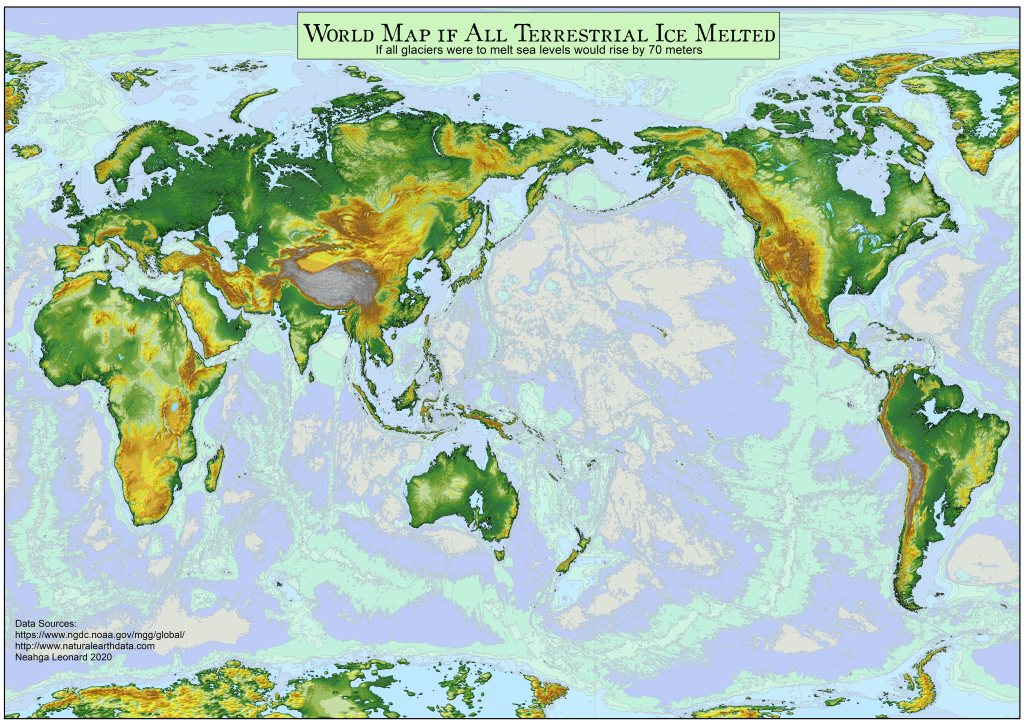 La figura rappresenta una mappa della Terra qualora tutto il ghiaccio si sciogliesse innalzando il livello dei mari di 70 metri