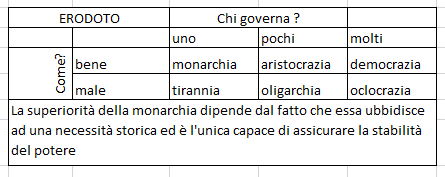 Segue poi elencando le varie possibili classificazioni delle forme di governo, che qui ci limitiamo a proporre in estrema sintesi