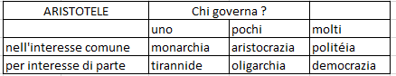 La teoria delle forme di governo di Aristotele è nota a tutti, anche se non sempre con le denominazioni da lui adottate. Egli identifica sei forme di governo che sono riassunte nella tabella