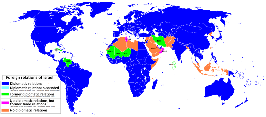 Ricopio integralmente questa riflessione attribuita al figlio di Liliana Segre e pubblicata in data 3 settembre sul Facciario (Facebook) da Alberto Nicoletta. Pur non potendo in questa sede confermare l’autenticità della fonte, ne condivido la maggior parte delle argomentazioni. Può piacere o no, ma Israele è uno stato sovrano legittimamente costituito e riconosciuto dalla maggior parte degli stati vigenti su questo pianeta (vedere figura, tratta da Wikipedia). Ricordiamo che “nel 1947 l’Assemblea generale delle Nazioni Unite approvò un piano di partizione della Palestina che prevedeva la costituzione di uno Stato ebraico e di uno arabo. Lo Stato d’Israele fu proclamato il 14 maggio 1948 (da Wikipedia)”