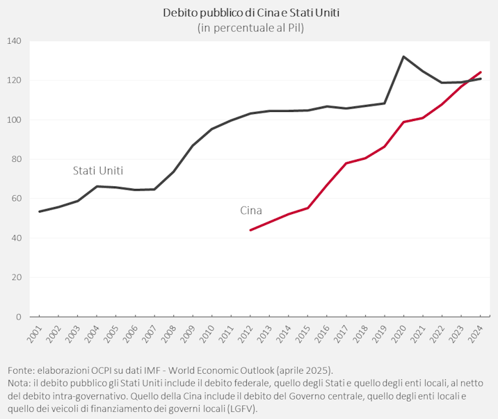 Testo dell’Osservatorio: Nel 2024, il debito pubblico degli Stati Uniti ha raggiunto il 121% del PIL, più che raddoppiando rispetto al 2000 a causa dei persistenti deficit primari. Nonostante l’alto livello, il debito è ritenuto sostenibile grazie al ruolo del dollaro come valuta di riserva globale, ma questo status potrebbe non essere garantito nel lungo periodo. Tuttavia, anche la Cina, principale rivale degli Stati Uniti nella competizione per l’egemonia economica globale, non sta molto meglio, con un debito pubblico (inclusivo del debito del governo centrale, quello degli enti locali e dei veicoli di finanziamento dei governi locali) che ha raggiunto negli ultimi anni il 124% del PIL.