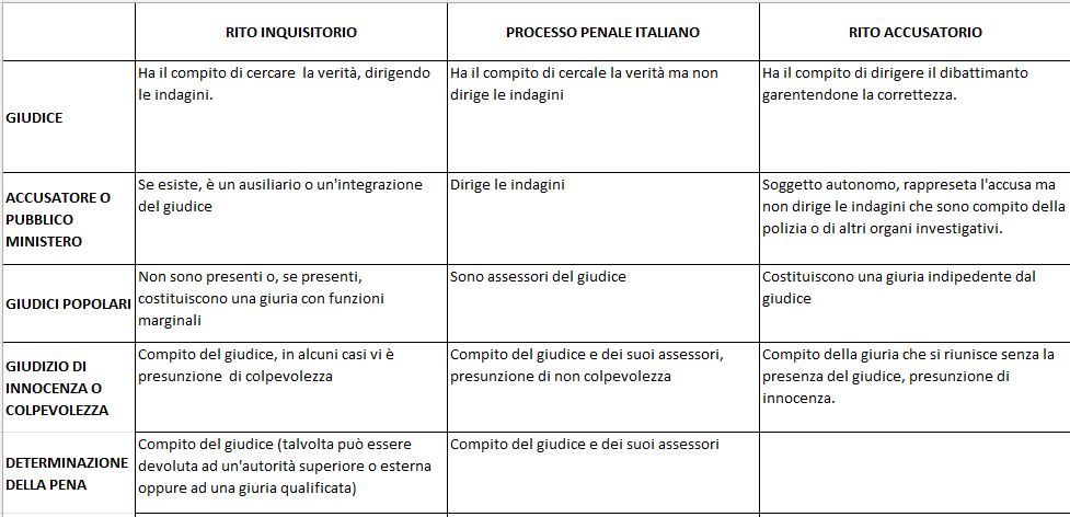 Il rito accusatorio lo possiamo vedere nei telefilm americani, in particolare in quelli di Perry Mason mentre del rito inquisitorio abbiamo un’immagine estremamente negativa, anche se ciò non è del tutto giustificato. Il rito processuale italiano è in realtà un rito intermedio come tenterò di spiegare nella tabella sotto riportata.