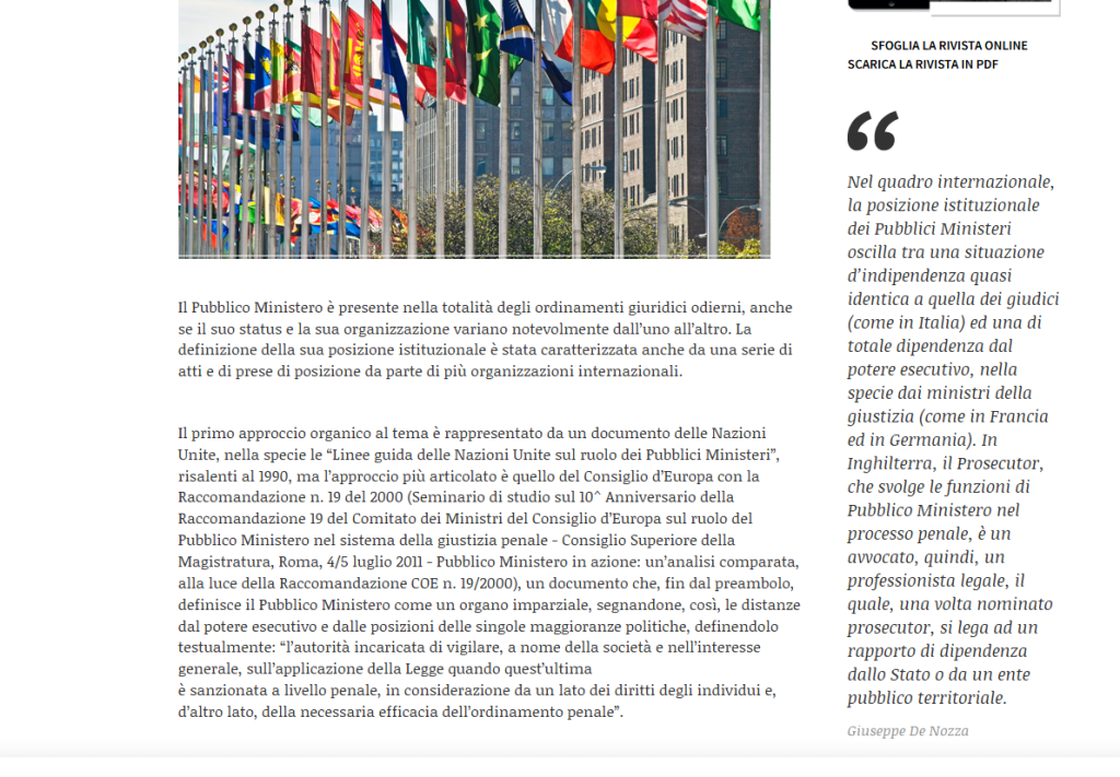 che in sintesi dice che “nel quadro internazionale, la posizione istituzionale dei Pubblici Ministeri oscilla tra una situazione d’indipendenza quasi identica a quella dei giudici (come in Italia) ed una di totale dipendenza dal potere esecutivo, nella specie dai ministri della giustizia (come in Francia ed in Germania). In Inghilterra, il Prosecutor, che svolge le funzioni di Pubblico Ministero nel processo penale, è un avvocato, quindi, un professionista legale, il quale, una volta nominato prosecutor, si lega ad un rapporto di dipendenza dallo Stato o da un ente pubblico territoriale.“